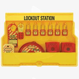 | Feature | <b>Price For:</b> Each <b>Portable</b>: No <b>Wall Mounting</b>: Yes <b>Color</b>: yellow <b>Material</b>: polycarbonate <b>Item</b>: Lockout Station <b>Max. Number of Padlocks</b>: 6 <b>Includes</b>: (6) Red Thermoplastic Padlocks, (8) Key Hooks, (1) 1" Steel Jaw Dia. Hasp, (1) Red Labeled Snap-On Hasp, (3) Gate Valve Lockouts (1" to 6-1/2" Valves), (2) Ball Valve Lockouts, (5) Moveable Dividers, (24) Tags, (24) Ties <b>Item</b>: Lockout Station |
