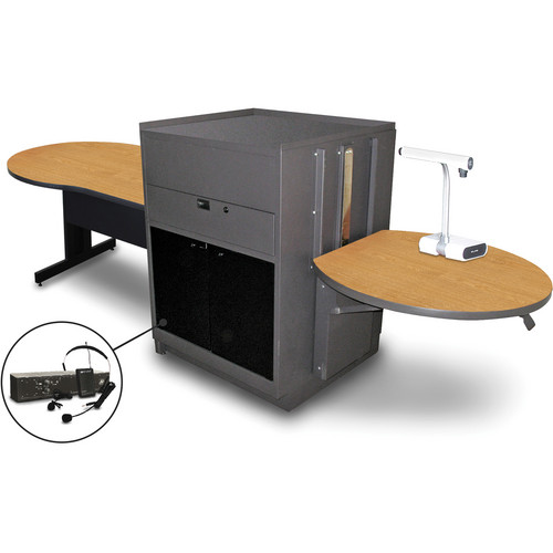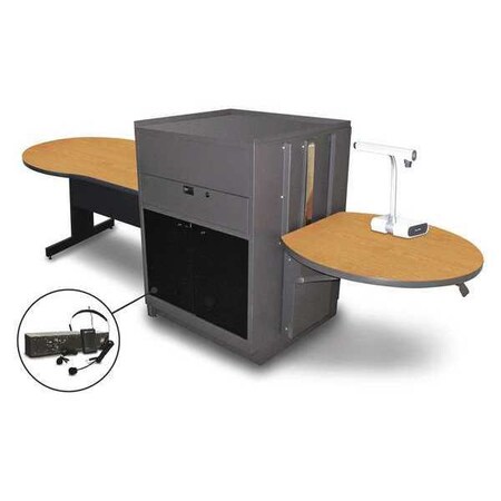 MVMTKA4830OKDT-E Finish: Oak Features: -Vizion collection. -Media center with desk. -Locking equipment cabinet for CPU. -16 Channel wireless transmitter bodypack with headset microphone 50 Watt amplifier. -Lockable acrylic doors. -Semi circular extended desk area. Product Type: -Full podium. Style: -Modern. Primary Material: -Metal. Powered: -Yes. Storage Included: -Yes. Clock Included: -Yes. Reading Light Included: -Yes. Wireless: -Yes. Sound System Included: -Yes. Country of Manufacture: -United States. Dimensions: -Adjustable Platform height: 26"- 42". -6 Speaker size: 2". Overall Height - Top to Bottom: -47". Adjustable Height: -Yes. Overall Width - Side to Side: -78". Overall Depth - Front to Back: -36". Overall Product Weight: -237 lbs.