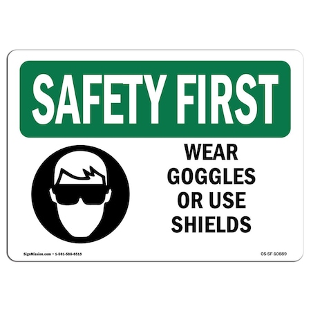OSHA SAFETY FIRST Sign, Wear Goggles Or Use Shields, 14in X 10in Rigid Plastic