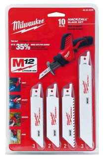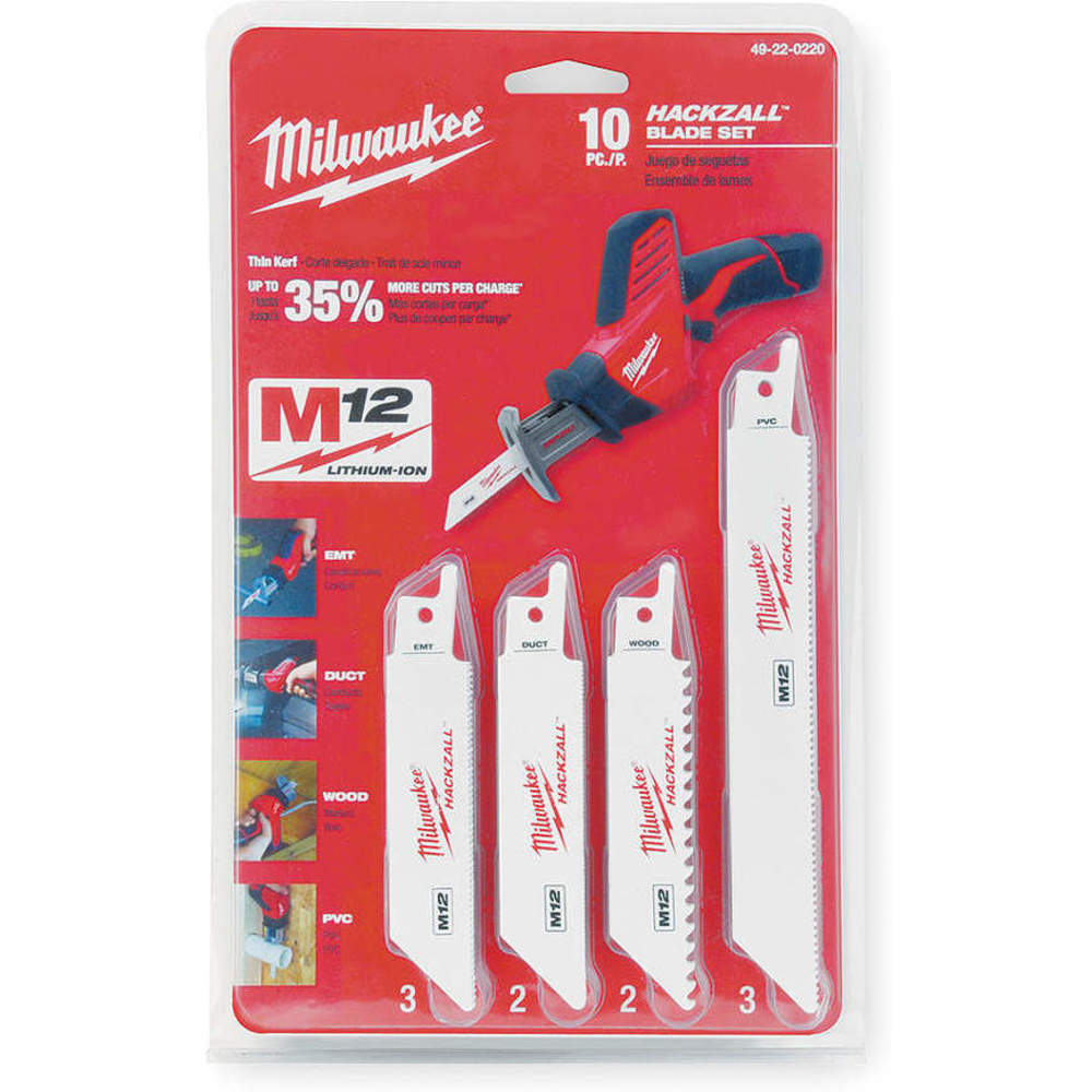 Sold as 2 UNITS at $20.69 per unit. (1 unit = each.) Use with M12 HACKZALL recip saw - SKU # 2198158. General purpose set. 10 piece set includes:. 2 wood blades (Ace #2202281). 3 EMT blades (Ace #2202778). 2 duct blades (Ace #2202786). 3 pvc blades (Ace #2202987). Storage pouch. Thin kerf for up to 35 percent more cuts per charge. Short blade length for cutting in tight locations. Bi-metal construction for increased tooth durability and blade life. Carded . Manufacturer number: 49-22-0220. SKU #: 2206456. Country of origin: (TBA). Distributed by Milwaukee Electric.