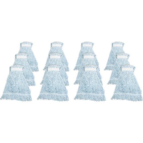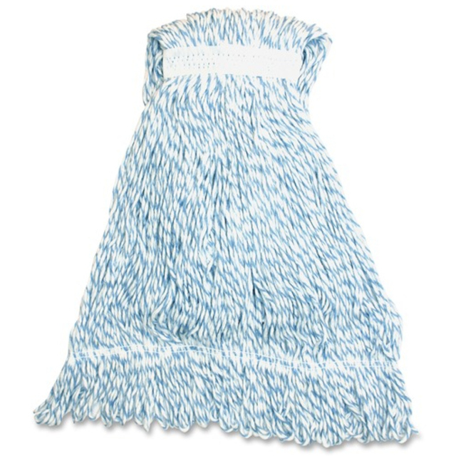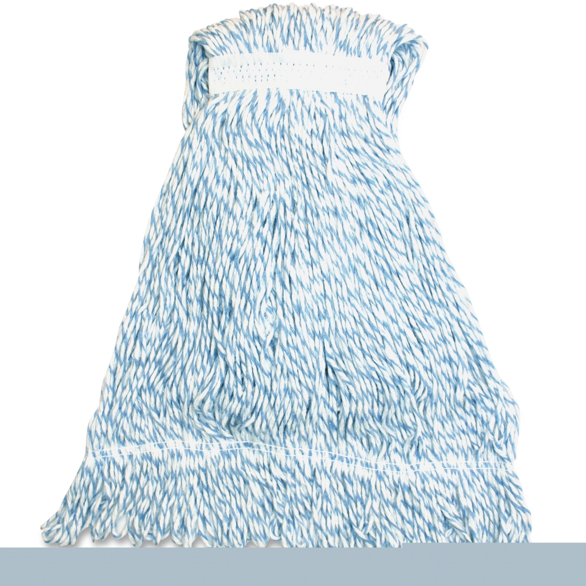 Mophead with blue stripes is designed for finishing applications. The Hygrade four-ply rayon yarn offers good absorption and release. Looped ends provide greater durability and launderability.