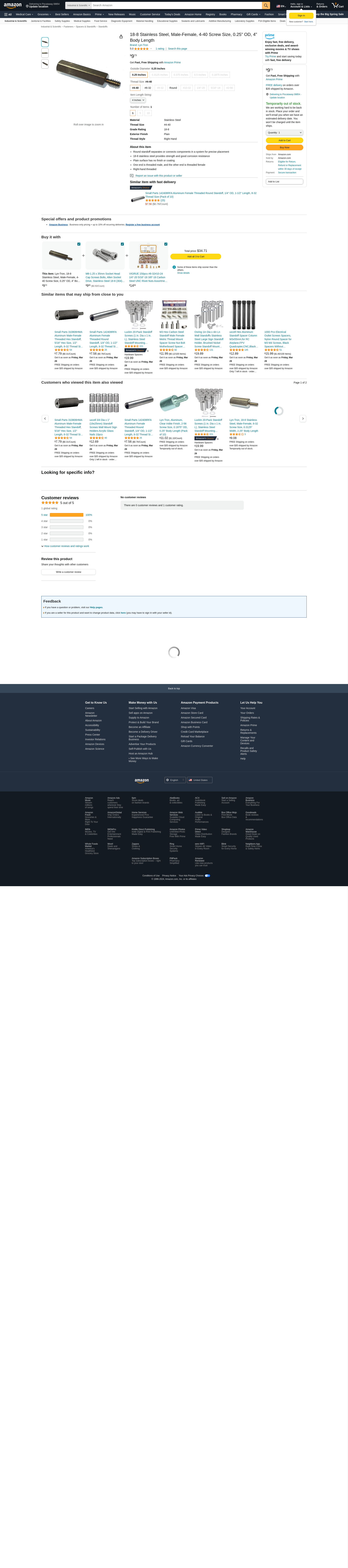 Lyn-Tron, 18-8 Stainless Steel, Male-Female, 4-40 Screw Size, 0.25" OD, 4" Body Length