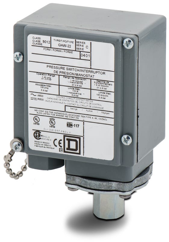 Square D 9012GA Single-Stage Diaphragm-Actuated Pressure Switch, 1-40 psi Press. Range, NEMA 4, 4X, and 13 Enc, 1/4"-18 NPTF Press. Connection, DPDT Contacts