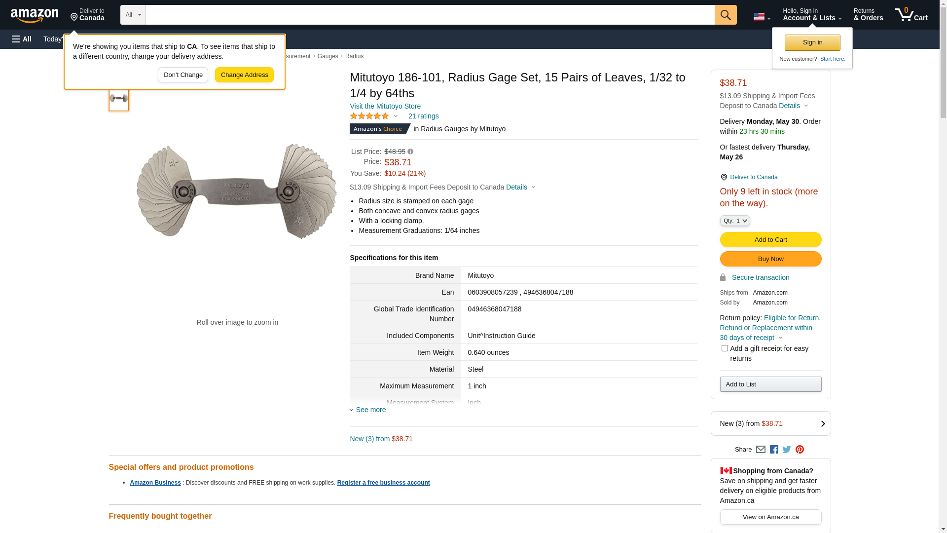 Mitutoyo 186-101, Radius Gage Set, 15 Pairs of Leaves, 1/32 to 1/4 by 64ths