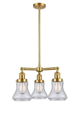 INNOVATIONS LIGHTING 207-SG-G194-LED Bellmont 3 Light Chandelier part of the Franklin Restoration Collection. The Bellmont 3 Light Chandelier is part of the Franklin Restoration Collection. Includes 1-6 and 2-12 inch Stems With Solid Brass 90 Degree Hang Straight Swivel for Sloped Ceilings. Solid Brass 90 Degree Hang Straight Swivel for Sloped Ceilings Included. Collection: Franklin Restoration. Material: Steel, Cast Brass, Glass. Metal Finish(Body): Satin Gold. Metal Finish(Canopy/Backplate): Satin Gold. Dimension(in): 18(W) x 13(H). Minimum Height (Fixture Height with Shade, Cord or Included Stems & Canopy)(in): 21.375. Max Height (Fixture Height with Cord or Included Stems & Canopy)(in): 45.375. Bulb: (3)3.5 Watt LED Vintage Medium Base Bulb Included,Dimmable. Color Temperature: 2700. Color Rendering Index(CRI): 82. Lumens): 350. Voltage: 120. Glass: Seedy Bellmont/Seeded. Shade Shape: Bell. Shade Material: Glass. Shade Size(in): 6 X 6.25. Shade Fitter Measurement: 3.25 inch Fitter. Canopy Dimension(in): 4.5 x 0.75. Includes 10 Feet of Wire. Solid Brass 90 Degree Hang Straight Swivel for Sloped Ceilings Included. UL/CUL Damp Rated. Warranty: 2 Year Finish, Lifetime Electrical.