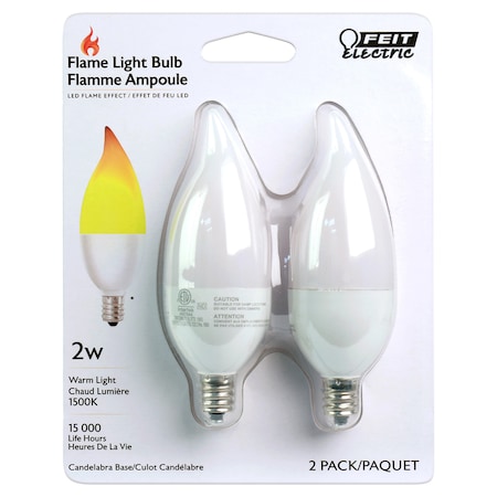 - FEATURES - This 6 pack of Feit Electric LED candelabra bulbs are non-dimmable and provide a beautiful flame effect. They produce an authentic live flame effect looks a real fire using just 2 watts of electricity. Get instant on to full brightness with relatively cool running performance. Feit Electric BPFLAME/C/LED light bulbs are RoHS compliant and are 100% mercury free for an energy efficient and way to give your home a cozy fireside touch.