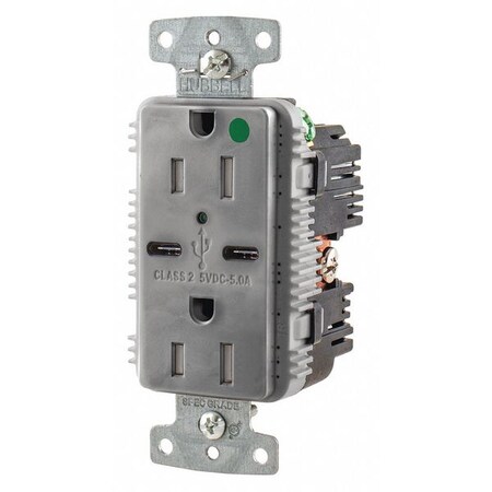 <br /><br /> Item: USB Charger Receptacle<br /> Application Environment: Hospital Grade<br /> USB Charging Capacity: 5.0A @ 5VDC<br /> Amps - Plugs and Receptacles: 15<br /> Number of USB Ports: 2<br /> USB Connector: Type C<br /> Tamper Resistance: Yes<br /> Wiring Method - Plugs and Receptacles: Back and Side<br /> Color - Plugs and Receptacles: Gray<br /> Type - Plugs and Receptacles: USB<br /> Mounting Type - Plugs and Receptacles: Flush<br /> Voltage - Plugs and Receptacles: 125VAC<br /> NEMA Receptacle Configuration - Plugs and Receptacles: 5-15R<br /> Outlet Type - Plugs and Receptacles: Decorator Duplex<br /> Power Indicator: Yes<br /> Weather Resistant - Plugs and Receptacles: No<br /> Item - Plugs and Receptacles: USB Charger Receptacle<br /> Number of Poles: 2<br /> Number of Wires: 3<br /> Phase: 1<br /> HP: 1/2<br /> Material of Construction: Nylon<br /> Standards: cULus<br />
