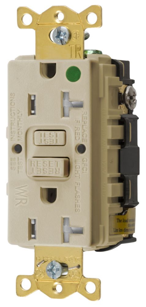 This Self-Testing GFCI receptacle is designed to protect personnel from shock hazards that can occur in electrical appliances and tools, especially in wet and damp locations. It meets UL requirements by automatically monitoring ground fault circuit interrupting functionality every 3 hours or less. Tamper-resistant with LED indicator.<br /><br /> Item: GFCI Receptacle<br /> Type - Plugs and Receptacles: GFCI<br /> Application Environment: Heavy Use Hospital Grade<br /> Self-Testing: Yes<br /> NEMA Receptacle Configuration - Plugs and Receptacles: 5-20R<br /> Number of Poles: 2<br /> Number of Wires: 3<br /> Tamper Resistant: Yes<br /> Weather Resistant - Plugs and Receptacles: Yes<br /> Amps - Plugs and Receptacles: 20<br /> Voltage - Plugs and Receptacles: 125VAC<br /> Color - Plugs and Receptacles: Ivory<br /> Outlet Type - Plugs and Receptacles: Decorator Duplex<br /> Mounting Type - Plugs and Receptacles: Flush<br /> Wiring Method - Plugs and Receptacles: Back and Side<br /> Item - Plugs and Receptacles: Receptacle<br /> Power Indicator: No<br /> HP: 1.0<br /> Reset Type: Automatic<br /> Surge Suppression: No<br /> Standards: UL Listed, CSA Certified<br />