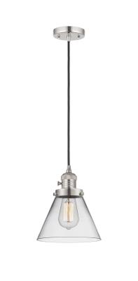 INNOVATIONS 201CSW-PN-G42 1-Light Mini Pendant Polished Nickel. Collection: Franklin Restoration. Style: Industrial, Farmhouse, Restoration-Vintage, Transitional. Metal Finish: Polished Nickel. Metal Finish (Canopy/Backplate): Polished Nickel. Material: Steel, Cast Brass, Glass. Dimension(in): 10(H) x 8(W) x 8(Dia). Min/Max Height (Fixture Height with Cord or Included Stems & Canopy)(in): 13.25/131.25. Wire/Cord: 10 Feet Of Black Textured Cord. Bulb: (1)60W Medium Base,Dimmable(Not Included). Maximum Wattage Per Socket: 100. Voltage: 120. Color Temperature (Kelvin): 2200. CRI: 99.9. Lumens: 220. Glass Shade Description: Clear Large Cone. Glass or Metal Shade Color: Clear. Shade Material: Glass. Glass Type: Transparent. Shade Shape: Cone. Shade Dimension(in): 7.75(W) x 6(H). Fitter Measurement (Glass Or Metal Shade Fitter Size): 3.25 inch Fitter. Canopy Dimension(in): 4.5(Dia) x 0.75(H). Sloped Ceiling Compatible: Yes. California Proposition 65 Warning Required: Yes. UL & ETL Certification: Damp Location.