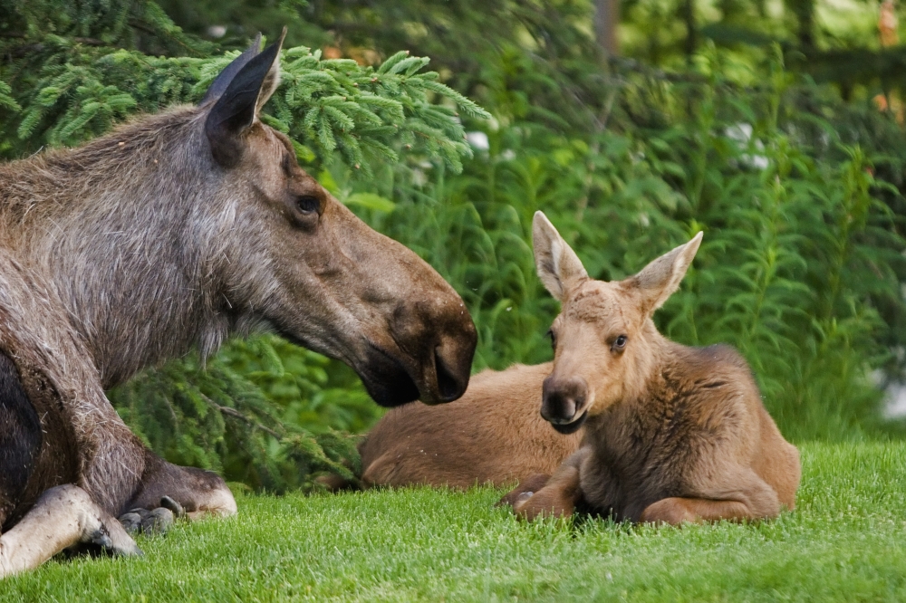 - Title: Cow Moose & Calves Laying On Lawn In Anchorage Residents Yard Sc Alaska Spring.