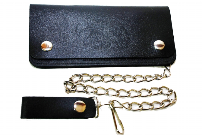 Features. Small front pocket for ID a deep zipper pocket for coins. A small compartment and deep back pocket for larger items.. Full flap with two snap closure.. Bi-fold chain wallet. Size - 7.5 x 3.5 in. with a 15 in. steel chain. Design - Embossed Eagle