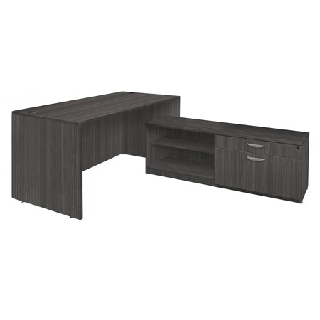 The Legacy Hi-Low L-Desk is a modern twist on a corner desk. It comes with a low credenza instead of a traditional return. The 20-inch high low lateral file has a box drawer and a file drawer that accepts both letter and legal filing. Both drawers lock and include ergonomically shaped black drawer pulls. Also standing at 20-inches high, the open storage cabinet has one adjustable shelf that can be moved in 1-inch increments. The low credenza is a perfect height to slide underneath the desk to save space. It can also be positioned on either side of the desk to accommodate both left and right handed individuals. The main desk measures 71-inches long and offers an extra wide 35-inch deep work surface so there is plenty of room to spread out, allowing you to multi-task and efficiently manage large work loads. Strategic grommeting keeps your work area looking clean and desktops cable and clutter free. Adjustable glides on the bottom of the base keep the desktop level and are easy to adjust. Finished in an stylish Ash Grey laminate, this desk shell coordinates with other Legacy furniture, which makes customizing easy. The Legacy collection is constructed of a 1-inch thick thermal fused melamine laminate with a 3-millimeter commercial grade matching PVC edge. Laminates are scratch, stain and scald resistant. Legacy casegoods are backed by a 10-year limited manufacturer's warranty.