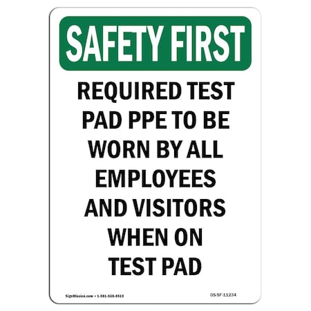 OSHA Safety First Sign - Required Test Pad PPE to Be Worn | Choose from: Aluminum, Rigid Plastic or Vinyl Label Decal | Protect Your Business, Work Site, Warehouse & Shop Area | Made in The USA
