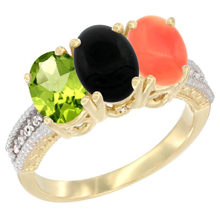 10K Yellow Gold Natural Peridot, Black Onyx & Coral Ring 3-Stone Oval 7x5 mm, sizes 5 - 10