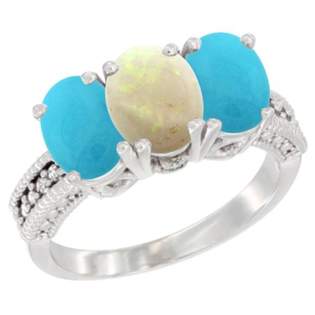 10K White Gold Diamond Natural Opal & Turquoise Ring 3-Stone 7x5 mm Oval, sizes 5 - 10