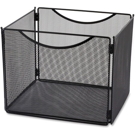 Portable file box with integrated handles features an open top for letter-size hanging files. Collapsible for easy storage when not in use. Durable steel mesh design with black powder-coat finish.