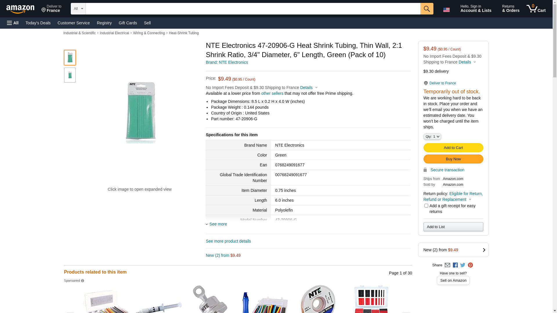 NTE Electronics 47-20906-G Heat Shrink Tubing, Thin Wall, 2:1 Shrink Ratio, 3/4" Diameter, 6" Length, Green (Pack of 10)
