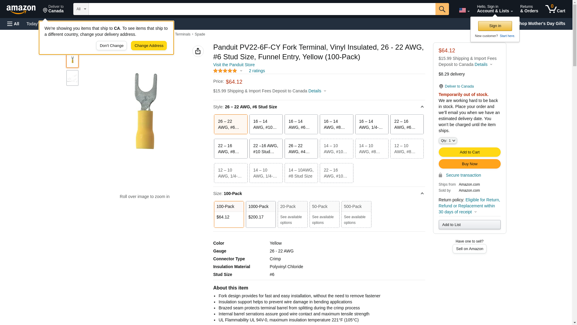Panduit PV22-6F-CY Fork Terminal, Vinyl Insulated, 26 - 22 AWG, #6 Stud Size, Funnel Entry, Yellow (100-Pack)