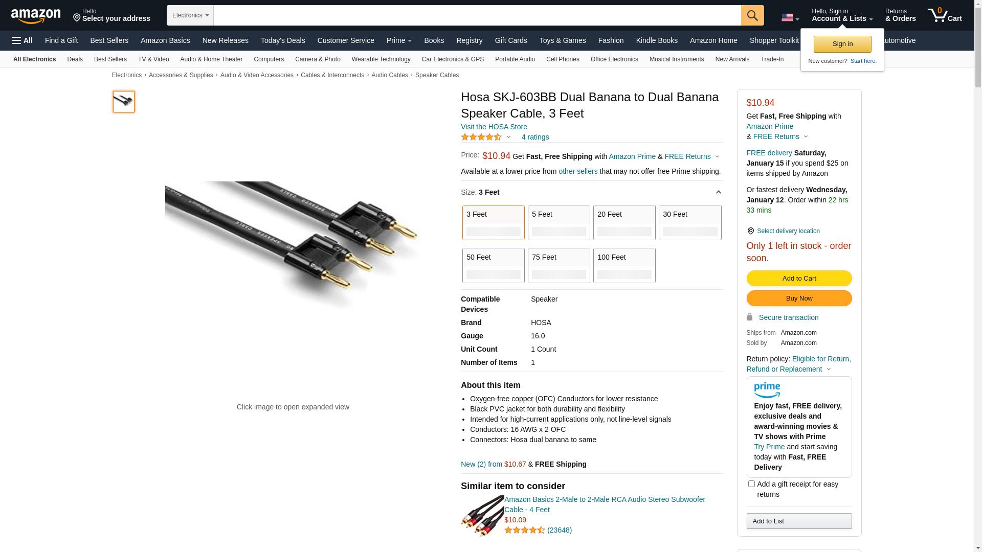 Hosa Speaker Cable, Hosa Dual Banana To Same, 10 Ft - SKJ-610BB