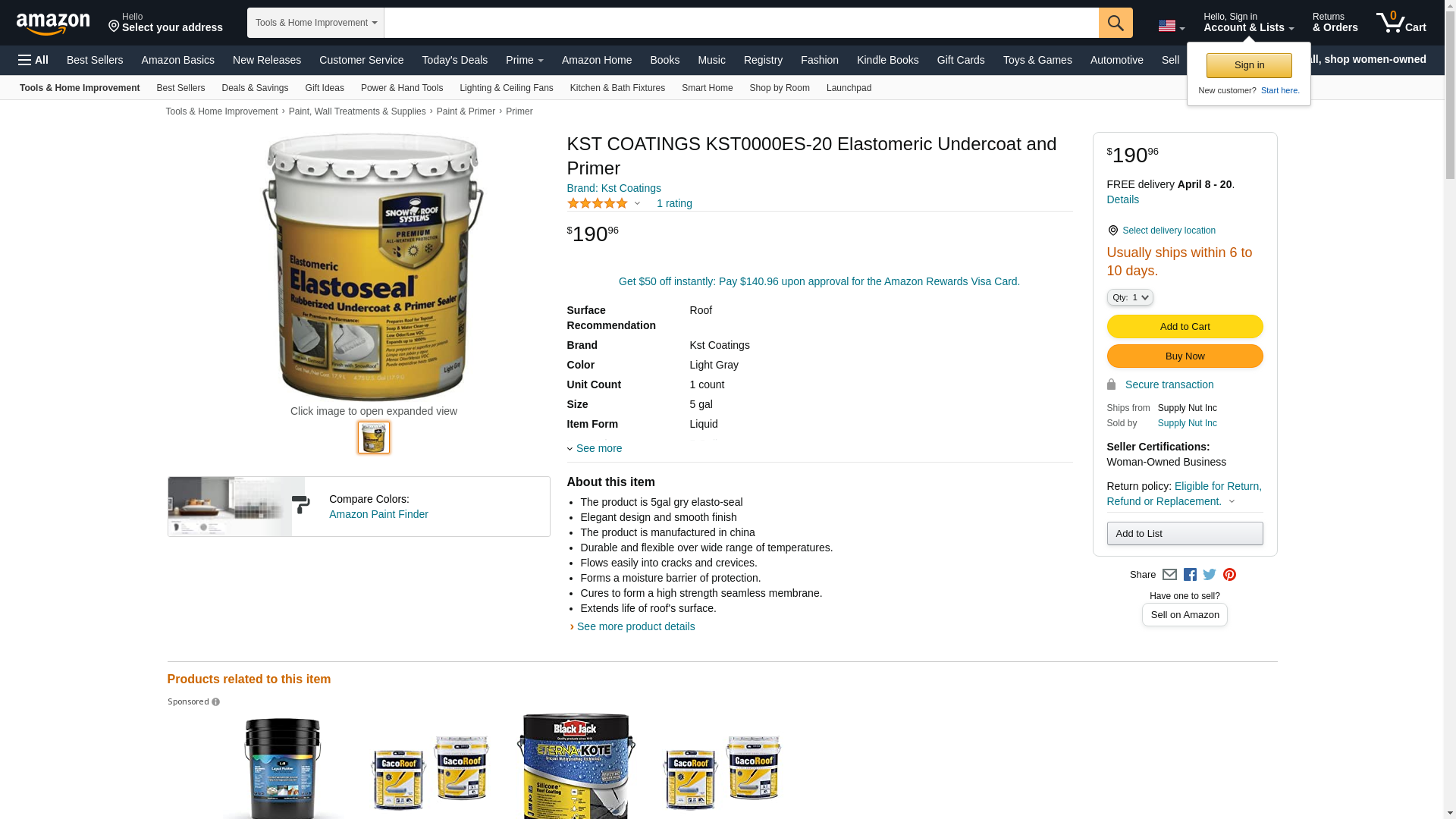| Feature | Price For: Each Application Method: Roll, Spray Surface: Metal, Concrete, Fiberglass, Masonry, Stucco Item: Elastomeric Undercoat and Primer Size: 4.75 gal. Color: Light Gray VOC Content: Less Than37g/L Coverage: 50 to 100 sq. ft./gal. Dry Time: 6 hr. Application Temperature: Above 50 Degrees F Dry Time Recoat: 24 hr. Country of Origin (subject to change): United States |