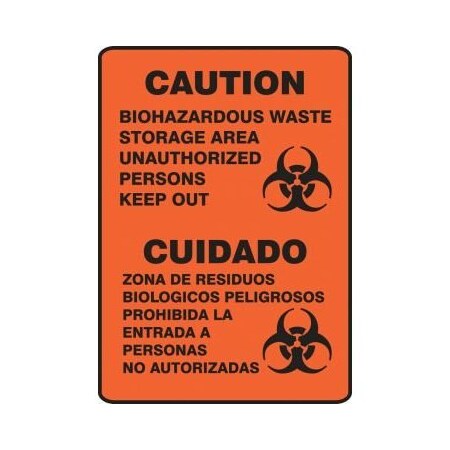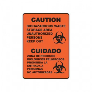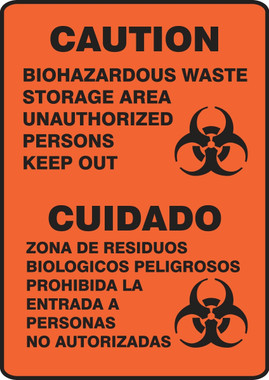 Bilingual Safety Signs (English & Spanish) - Caution - Biohazardous Waste Storage Area Unauthorized Persons Keep Out, 14" x 10". Versatile, Stick-nearly-anywhere vinyl sign and with UV protection. Adhesive Dura-Vinyl is a custom sign material with dual-layered vinyl that outperforms standard vinyl. Printed image is protected by a high-gloss, 1-mil, UV-resistant polyester over-laminate. Guaranteed for 5 years.<br><br>Flexible poly-composite material with UV protective laminate is resistant to abrasions, humidity, chemicals, solvents, and fading from sunlight. Permanent, acrylic adhesive back with peel-off liner adheres to smooth, curved, and irregular surfaces. <br>Service temperature range is -40 to 176F.