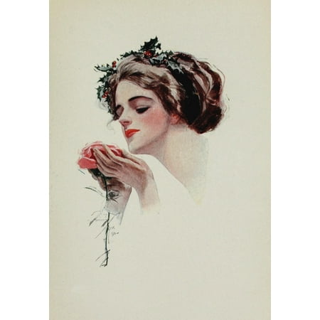 Harrison Fisher Stretched Canvas Art - American Girls in Miniature 1912 Holly girl with rose - Large 24 x 36 inch Wall Art Decor Size.