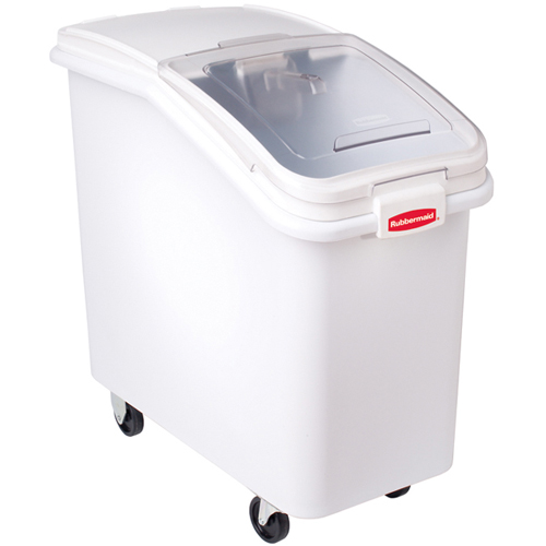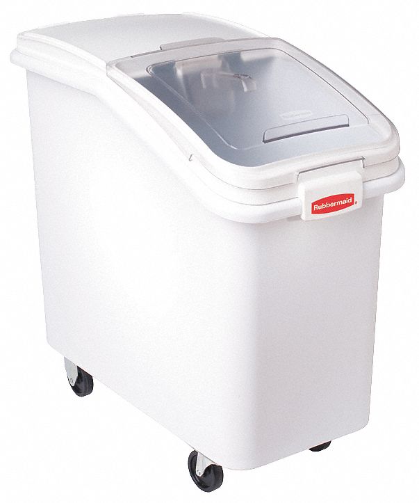 The Rubbermaid FG360288WHT is a food storage container with an integrated sliding lid for one-handed access, a clear door for quick identification of ingredients, and an integrated scoop and storage for food code compliance. It is certified to NSF Standard #2 and can be transported on casters.