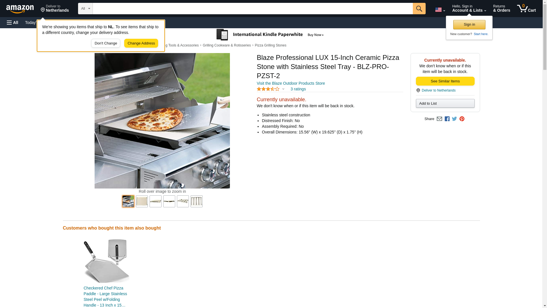 Blaze BLZ-PRO-PZST-2 Pro Pizza Stone. Features: Model: BLZ-PRO-PZST-2. Brand: Blaze Outdoor Products. Weight: 15 lbs.. Stainless steel construction. Distressed Finish: No. Assembly Required: No. Specifications: Overall Dimensions: 15.56'' (W) x 19.625'' (D) x 1.75'' (H).