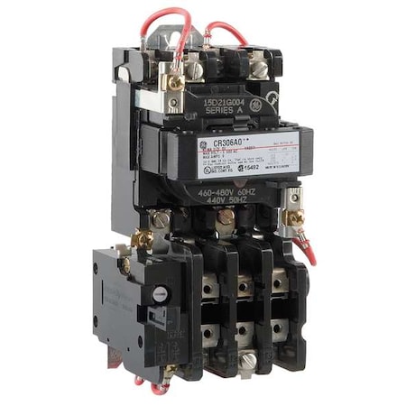 CR306A004 FULL VOLTAGE, NON COMBINATION, NON REVERSING TYPE; NEMA 00 SIZE; 9 AMPERE CURRENT RATING; OPEN ENCLOSURE TYPE; NEMA CONSTRUCTION STANDARD; 440 VAC AT 50 HZ, 460 TO 480 VAC AT 60 HZ COIL VOLTAGE; 2 HP POWER RATING/VOLTAGE; 3 LEG BLOCK (2) THERMAL BIMETALLIC OVERLOAD RELAY MANUAL RESET OVERLOADS; 3 PHASE; GE FASTRAC[T] BRAND; INCLUDES HOLDING INTERLOCK, PRESSURE TERMINAL FOR LINE AND LOAD CONNECTION; CR306 MODEL