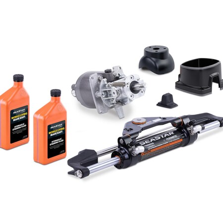 This popular outboard hydraulic steering system offers smooth, super-efficient steering for high performance hulls with single or multiple outboards up to 700 hp combined. Helm and cylinder now equipped with adjustable O-ring fittings to simplify the installation process and allow for simple reorientation of the fittings after installation.<BR><B>Application:</B> Single and dual non-power assisted outboard engines up to 350 hp (700 combined HP for counter-rotating duals) that have ABYC standard engine tilt tube. Ideal for cruisers, runabouts, center consoles, offshore fishing boats, and many more. Suitable for speeds up to 60 MPH and dual station use (with purchase of extra helm, hose and fittings). Allows independent engine tilt in dual engine installations. Dual engines require purchase of a tie bar kit and extra hardware. Hoses sold separately.<BR><STRONG>Features:</STRONG><BR><UL><LI>5 turns lock-to-lock with 1.7 helms</LI><BR><LI>Compact tilt helm</LI><BR><LI>Complete with helm, cylinder, fittings, oil and bleeder kit</LI><BR><LI>Standard 3/4" tapered shaft</LI></UL><BR><STRONG>Includes:</STRONG><BR><UL><LI>HH65413 - Seastar Tilt Helm Classic 1.7</LI><BR><LI>HC53453 - Seastar Pivot Cylinder</LI><BR><LI>HA5430 (2) - Hydraulic Oil (1 Liter)"</LI></UL>