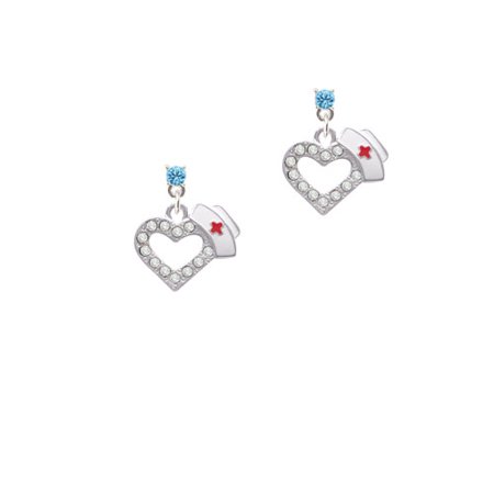 Small Crystal Heart with Nurse Hat - Hot Blue Crystal Post Earrings. Charms. Charm size is approx. 0.59 x 0.7 x 0.1 inches (HxWxD) including loop. 3.3mm Crystal Earrings with steel posts. Earring backs are Bullet ''Clutch'' Style with Plastic Pad. Available crystal colors: Maroon, Red, Orange, Yellow, Lime Green, Green, Teal, Hot Blue, Blue, Purple, Light Purple, Light Pink, Hot Pink, Black, Clear, and Brown. Makes a great gift! PLEASE NOTE: Our products are lead safe, but are not intended for children 14 years and younger.