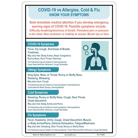 <p><strong>Word Message:</strong></p> <p>COVID-19 vs Allergies, Cold & Flu KNOW YOUR SYMPTOMS Seek immediate medical attention if you develop emergency warning signs of COVID-19. Possible symptoms include: Difficulty breathing/shortness of breath, Persistent pain or pressure in the chest, New confusion or inability to arouse, Bluish lips or face.</p> <p>COVID-19 Symptoms: Fever, Dry Cough, Shortness of Breath, Tiredness; May also feel: Body Aches, Nasal Congestion, Runny Nose, Sore Throat, Diarrhea.</p> <p>Allergy Symptoms: Itchy Eyes, Nose, or Throat, Runny or Stuffy Nose, Sneezing, Wheezing May also have: Cough.</p> <p>Cold Symptoms: Sneezing, Runny or Stuffy Nose, Cough, Sore Throat, Chest discomfort May also feel: Body Aches and Pains.</p> <p>Flu Symptoms: Fever, Headache, Chills, Cough, Chest Discomfort, Muscle or Body Aches/Pains, Extreme Exhaustion, Fatigue/Weakness, May also feel: Sneezing, Sore Throat, Runny or Stuffy Nose.</p> <p><strong>Description: </strong><br />Clarion Safety Systems brings you COVID-19 vs. Allergies signs (F1356-) which are produced on premium materials and are expertly designed to meet your safety sign needs.</p><p><strong>Material Information:</strong></p> <ul> <li><strong>Material</strong>: (ZA) Indoor/Outdoor Flexible Polyester</li> <li><strong>Base Materials</strong>: 3M .002 premium white polyester</li> <li><strong>Overlaminate</strong>: 3M .002 matte vinyl</li> <li><strong>Mounting Option</strong>: 3M Premium Structured Acrylic</li> <li><strong>Application</strong>: Indoor/Outdoor</li> <li><strong>MaxTemp</strong> (F): 225</li> <li><strong>MinTemp</strong> (F): -20</li> <li><strong>Chemical Resistance</strong>: Excellent</li> <li><strong>UV Resistance</strong>: Good</li> <li><strong>Outdoor durability</strong>: Excellent</li> <li><strong>Expected Life Indoor</strong>: Long term</li> <li><strong>Expected Life Outdoor</strong>: 3-5 year (expected outdoor life may vary due to climatic conditions)</li> </ul>