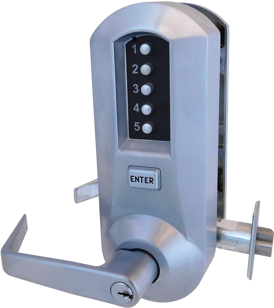 Mechanical retraction of latch upon entry of code. Latch retracts when lever is turned in either direction. Americans with Disabilities Act (ADA) compliant. Non-handed, pre-assembled for left-hand door installations - easily changed in the field. 3-hour UL/ULC fire rating for 'A' label doors. Ideal for controlling access to high traffic security sensitive areas. Installs on wood or metal doors. Quick and easy combination change to ensure continued maximum security. Extra heavy duty - Ansi 156.2 Grade 1 Certified. Mechanical key override. Suits doors 35-57mm thick. Code change from outside.
