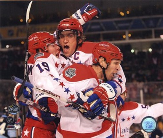 Alex Ovechkin, Nicklas Backstrom, & Mike Knuble Celebrate 2011 NHL Winter Classic hockey poster. Hockey posters and art prints for homes, dorm rooms, office and empty walls everywhere.