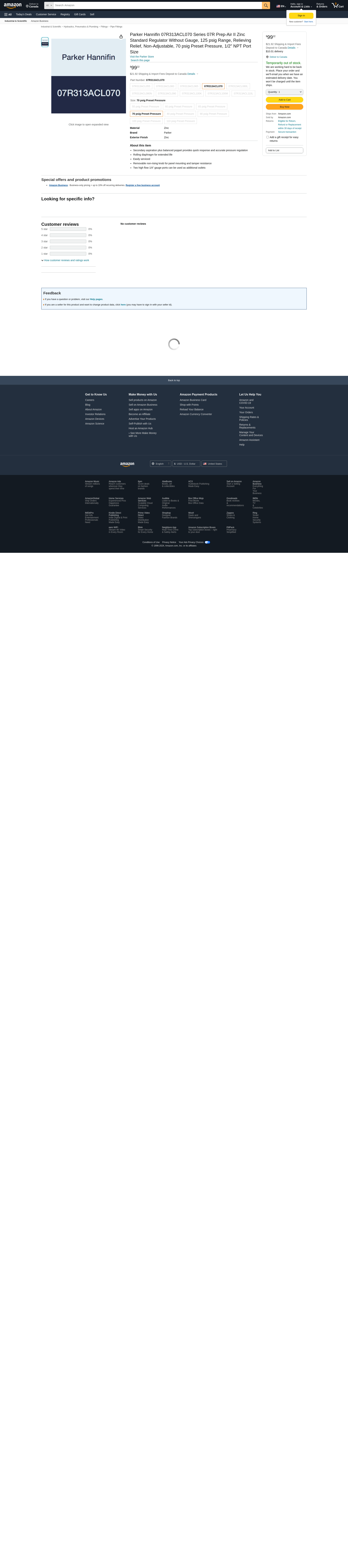 Parker Hannifin 07R313ACL070 Series 07R Prep-Air II Zinc Standard Regulator Without Gauge, 125 psig Range, Relieving Relief, Non-Adjustable, 70 psig Preset Pressure, 1/2" NPT Port Size