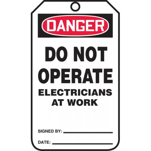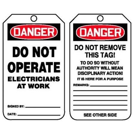 Accuform MDT166CTP Safety Tag, Legend "Danger DO NOT Operate Electricians at Work", 5.75" Length x 3.25" Width x 0.010" Thickness, PF-Cardstock, Red/Black on White (Pack of 25)