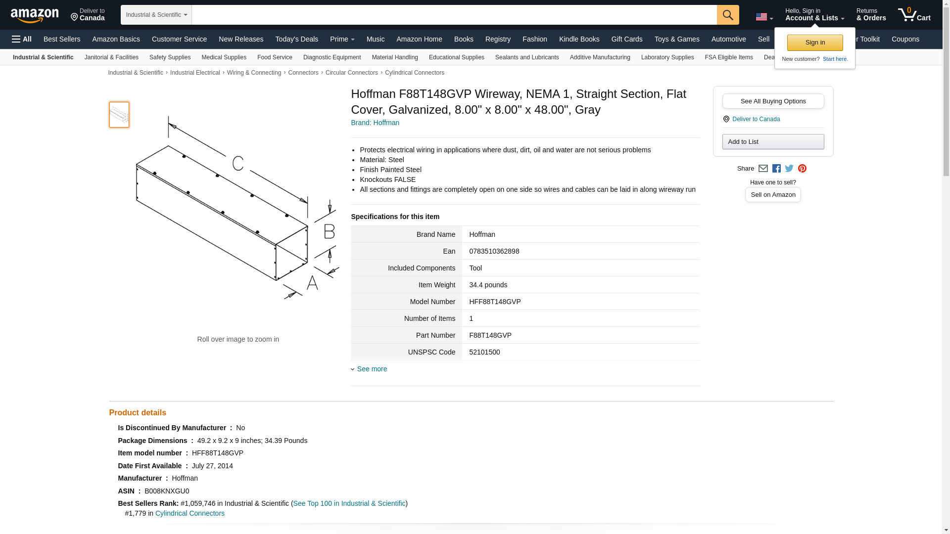 Hoffman F88T148GVP Wireway, NEMA 1, Straight Section, Flat Cover, Galvanized, 8.00" x 8.00" x 48.00", Gray