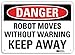 Danger Sign, Vertical Rectangle, Number of Printed Sides 1, English, Sign Format Traditional OSHA, Sign Legend Robot Moves Without Warning Keep Away, Sign Legend Background Color White, Sign Legend Style Text