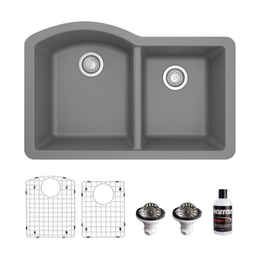 KARRAN QU-610-GR-PK1 QUARTZ QU 32 INCH UNDERMOUNT QUARTZ COMPOSITE 60/40 DOUBLE BOWL KITCHEN SINK KIT, GREY