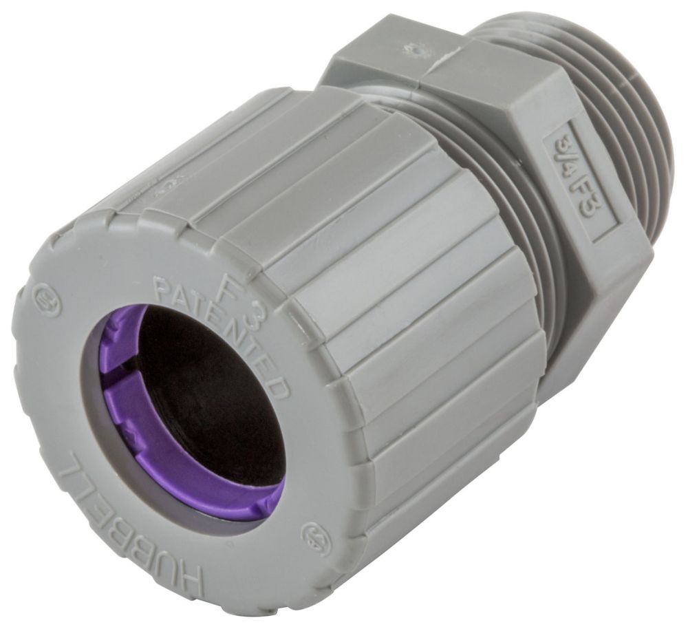 This connector is for use in washdown areas. The proprietary split-hinge Gotcha ring, color-coded by cord size, grips the conductor through the cord jacket. The factory-lubricated bushing provides even compression, ensures a liquidtight seal around the cord, and minimizes tension on the terminals. Nylon is tough, durable, and highly resistant to corrosion.<br /><br /> Item: Liquid Tight Cord Connector<br /> Material: Nylon<br /> Conduit Size: 3/4"<br /> Length: 2-5/32"<br /> Cord Dia. Range: 0.75" to 0.88"<br /> Number of Cords: 1<br /> Connector Type: Straight<br /> Color: Orchid<br /> Standards: CSA LR27378/UL E54218(M)<br />