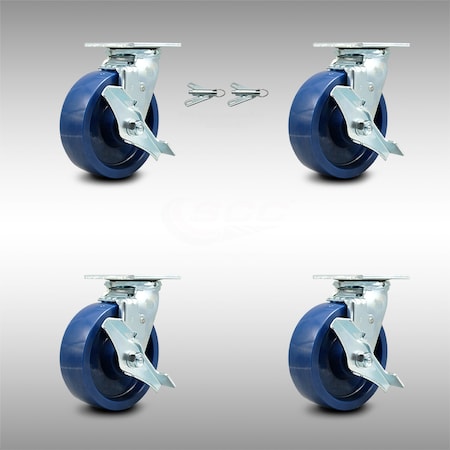 Stainless Steel Solid Polyurethane Swivel Caster w/Main. Free Bearings Set 4 w/6" x 2" Blue Wheels-Includes 2 Swvl w/BRK and Bolt on Swvl Lcks&2 Swvl w/Brakes-4800 lbs Total Cpty- Service Caster Brand