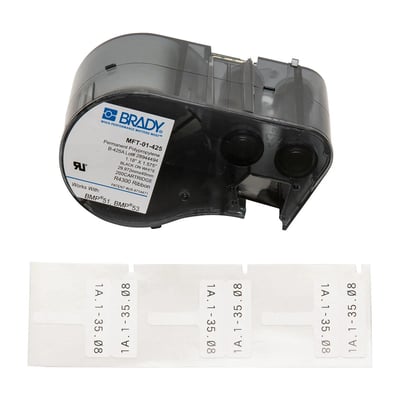 Brady, MFT-01-425, 143248 1.18"x0.788" BMP51/BMP53 Wire and Cable Flag Polypropylene Label White B-425 thermal transfer printable Polypropylene is ideal for labeling applications requiring excellent solvent resistance and print performance. No visible affect to label when exposed to most common chemicals, oils or water. UL approved; CSA accepted. Meets requirements of a halogen-free material per DIN VDE 0472 part 815. All-in-one cartridge includes label supply and R4300 Series ribbon.