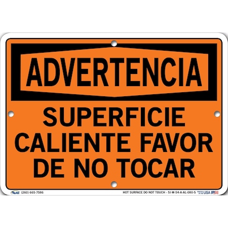 Vestil SI-W-54-A-AL-080-S HOT SURFACE DO NOT TOUCH/SUPERFICIE CALIENTE FAVOR DE NO TOCAR Warning Sign, Aluminum, 0.080" Overall Size, 10.5" W x 7.5" H