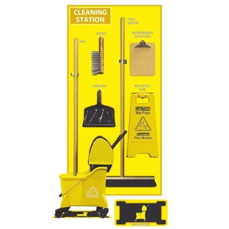 - Tools Included: 11 1/2" Wide Metal Dust Pan, 8" Soft Grey Flagged Counter Duster, 13" Wood Handle W/ 2 1/2" Long Bristles, 60" Wood Threaded Push Broom Handle W/ Lacquered Finish, 24" Tampico Push Broom Head W/ 2 1/2" Bristles, Heavy Duty Plastic Wet Floor Sign, 9" X 12 1/2" Pressboard Clipboard, Adhesive Backed "Mop Bucket" Floor Sign, Cotton Mop Head 5-Ply, 1/8" X 60" Metal Wing Nut Wood Mop Handle, Dual Cavity Yellow Mop Bucket W/ Stainless Steel Handle And Plastic Wheel Assemblies W/ 35Qt Capacity
