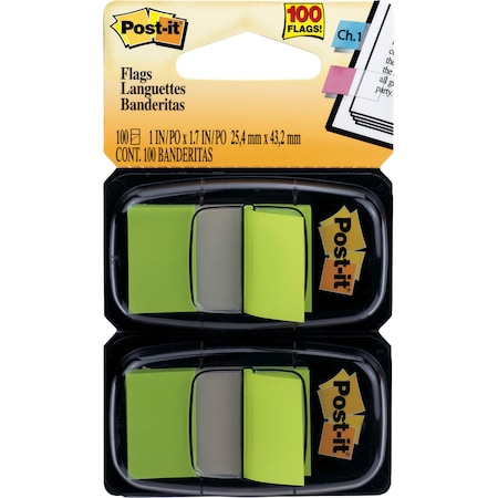 Post-it® Flags, 1" Wide, Bright Green, 50 Flags/Dispenser, 2 Dispensers/Pack