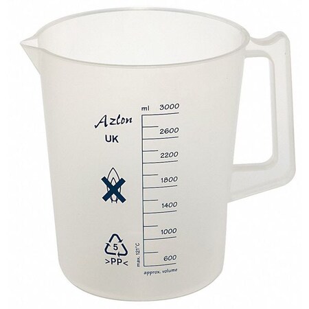 Azlon 526475-3000 Polypropylene Intermediate Form Graduated Beaker/Lab Pitcher with Handle Printed Graduations, 3000mL Capacity