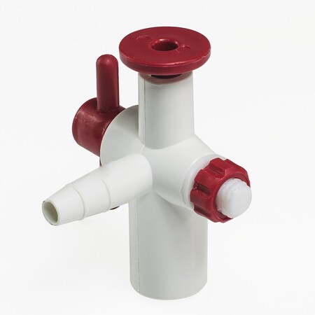 Polypropylene body features PTFE plug and washer High visibility bright red handle with nut Taper fits on desiccator port to provide easy, leak-proof turning Plug is 3 way for vacuum draw, shut-off and vacuum rel