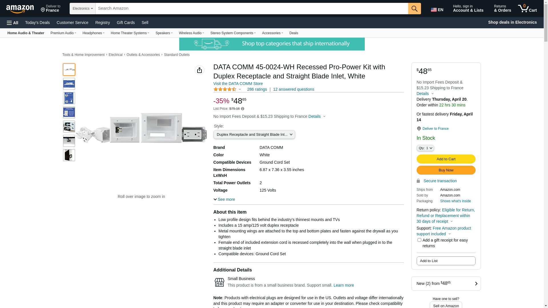 DATA COMM 45-0024-WH Recessed Pro-Power Kit with Duplex Receptacle and Straight Blade Inlet, White