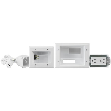 The Recessed Pro-Power Kit with Duplex Receptacle and Straight Blade Inlet is used to install power and low voltage cables behind your HDTV, your amplifier or other audio/video devices. This power relocation kit allows you to pass low voltage cables and power through the wall, creating a professional, clean look for every home theater. This kit is available in a surge model.