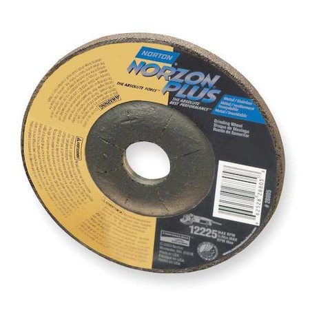 The NORTON Type 27 high-performance grinding and cutting wheel features ceramic/zirconia alumina abrasive grain for best performance. Use for ferrous metal, gray iron, and stainless steel.<br /><br /> Item: Depressed Center Wheels<br /> Abrasive Wheel Type: Type 27<br /> Abrasive Wheel Diameter: 4-1/2"<br /> Thickness: 1/4"<br /> Arbor Hole Size: 5/8"-11<br /> Abrasive Material: Ceramic<br /> Abrasive Grit: 20<br /> Max. RPM: 13,580<br /> Series: NorZon Plus Long Life<br /> Grade: Extra Coarse<br /> Application: Ferrous Metal, Gray Iron, Stainless<br />